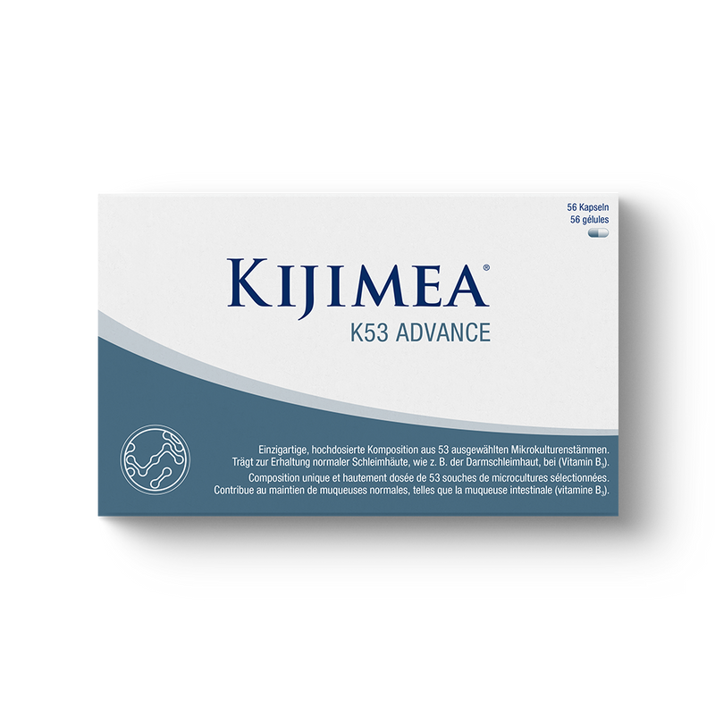 Kijimea K53 Advance ist ein Multi-Spezies-Probiotikum zur täglichen Anwendung mit einer einzigartigen Kombination aus 53 ausgewählten Mikrokulturen. Außerdem enthält Kijimea K53 Advance zusätzlich Biotin und Niacin, die zum Erhalt normaler Schleimhäute beitragen. Damit imitiert Kijimea K53 Advance das natürliche Mikrobiom in seiner Anzahl und Vielfalt.
